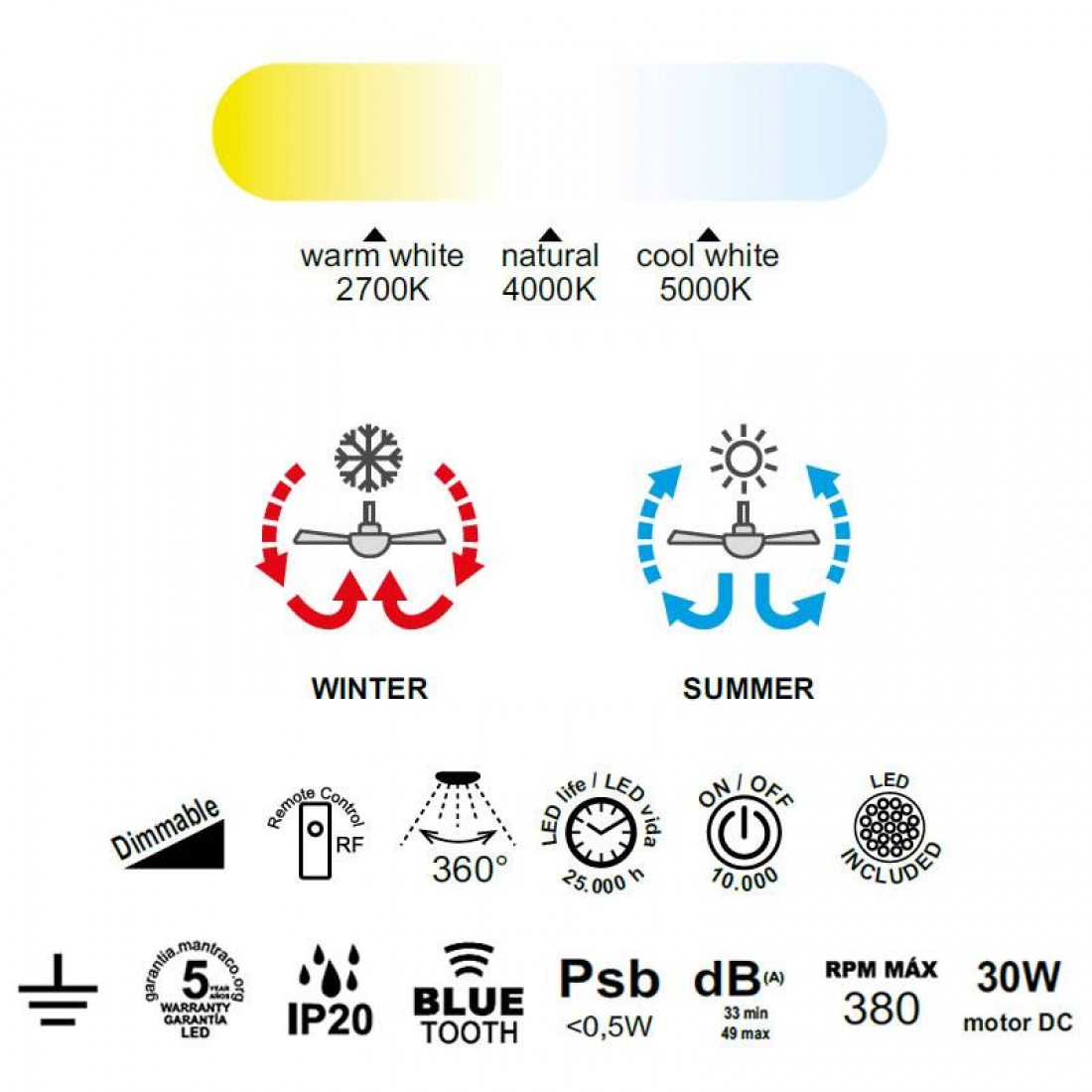 Όλες οι λειτουργίες του ανεμιστήρα οροφής Nature μπορούν να ελεγχθούν από το τηλεχειριστήριο (συμπεριλαμβάνεται) ή μέσω της εφαρμογής Bluetooth για κινητά.