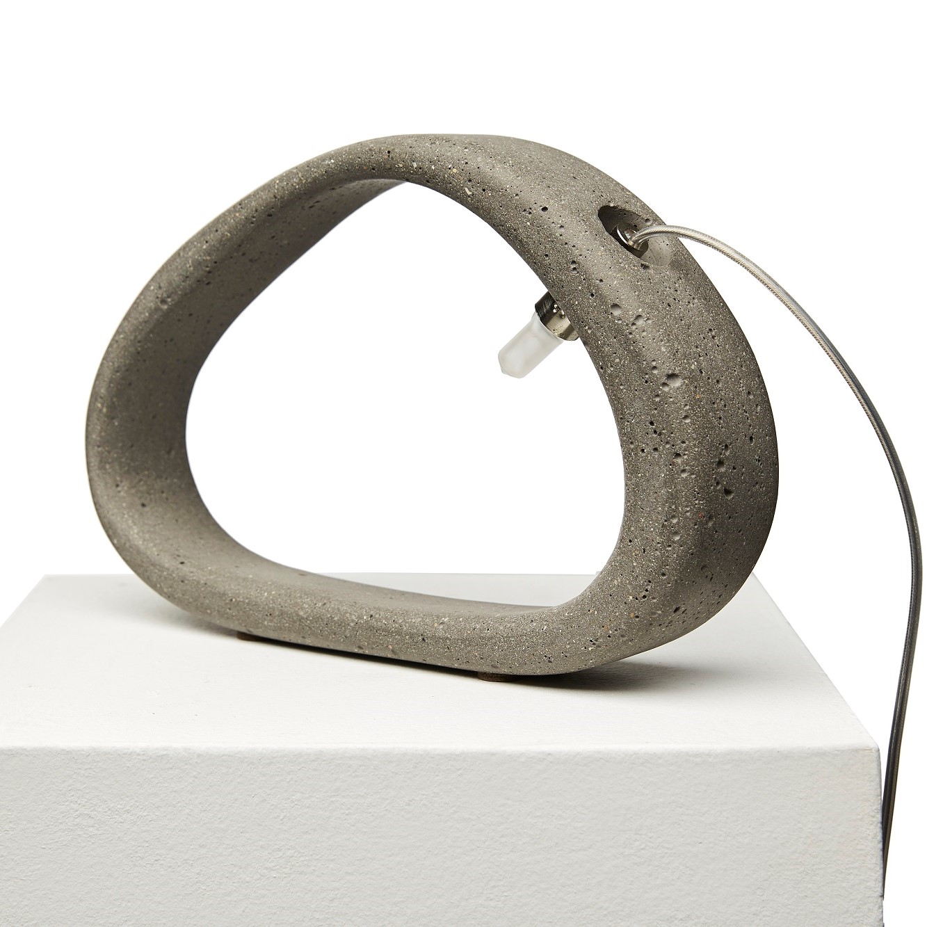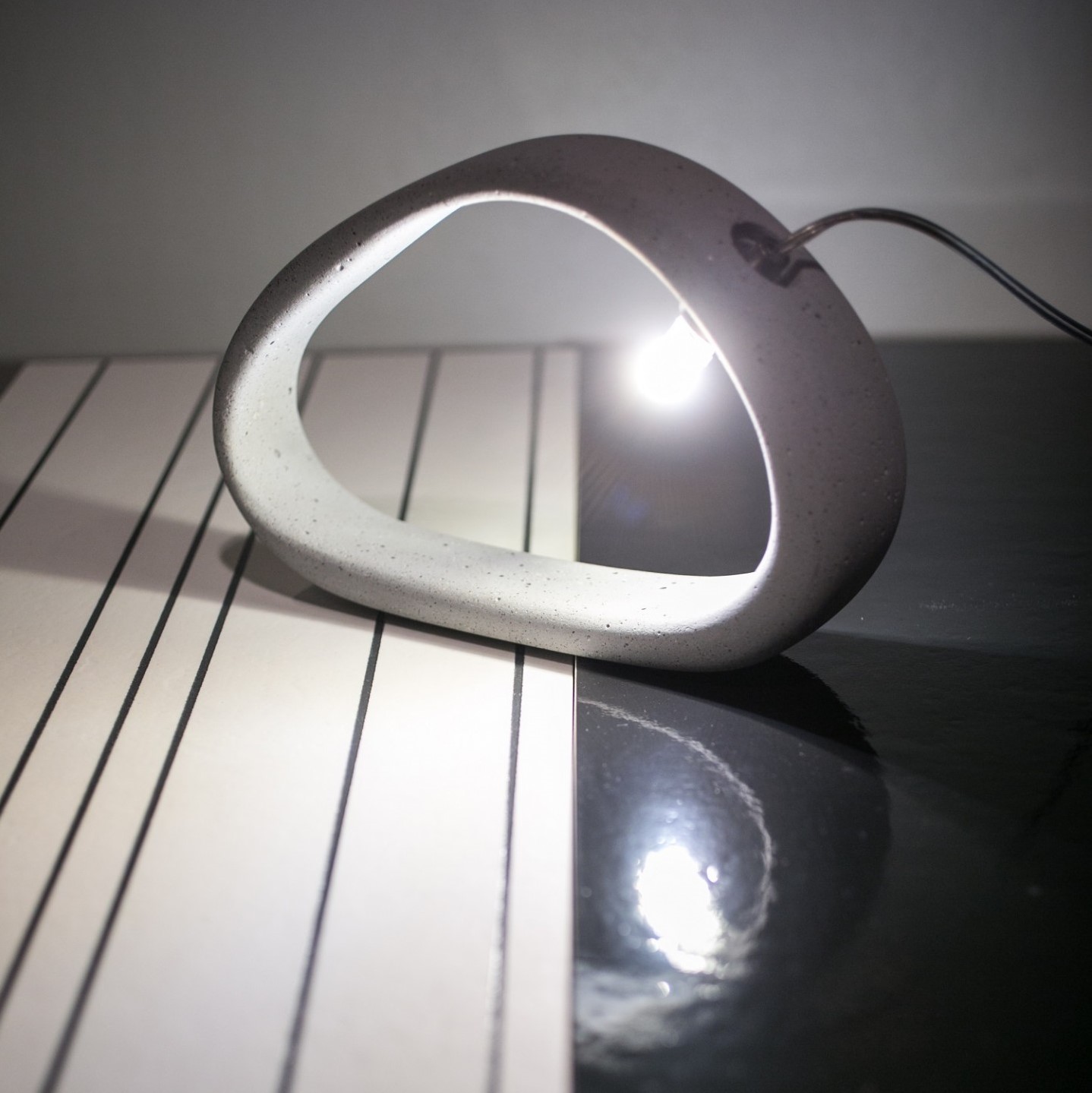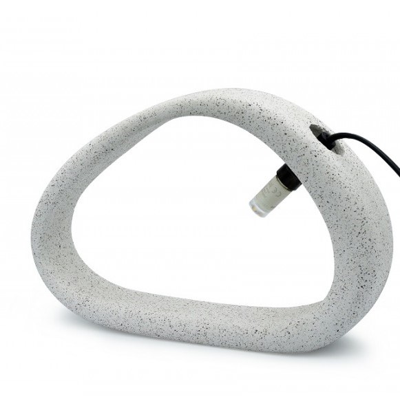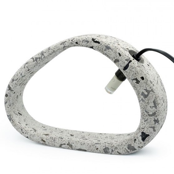 Επιτραπέζιο φωτιστικό από τσιμέντο, σε οργανική φόρμα. Διαθέσιμο σε πέντε χρωματισμούς: ανθρακί, γκρι, ιβουάρ, λευκό μωσαϊκό ή μαύρο μωσαϊκό. Η υφή του υλικού είναι αδρή λόγω της πρόσμιξης άμμου στο μίγμα τσιμέντου.