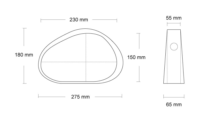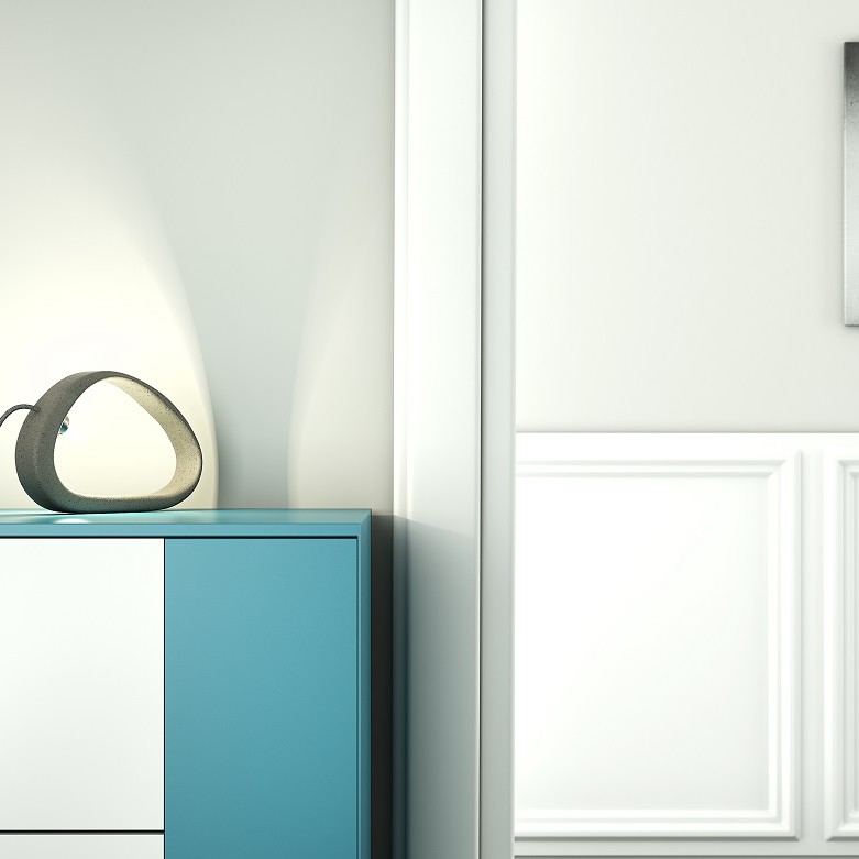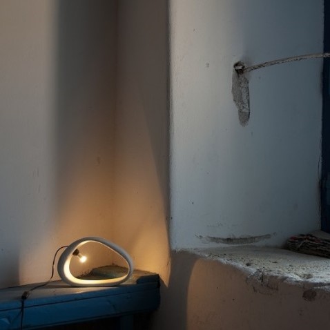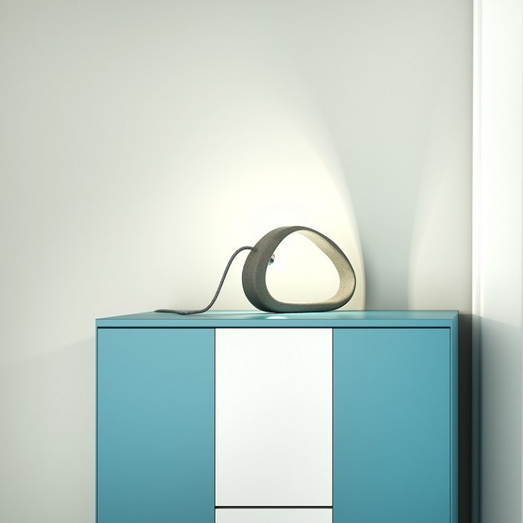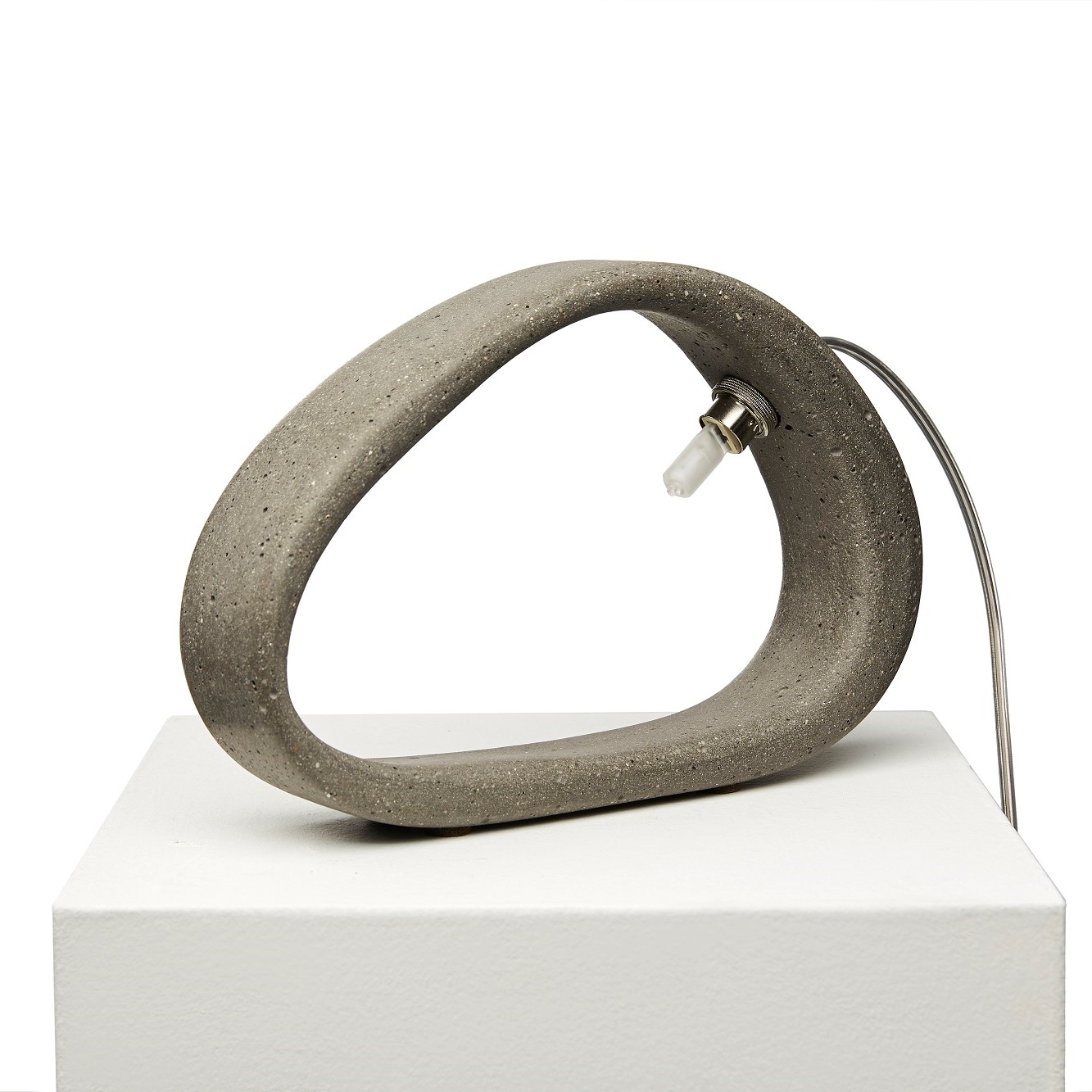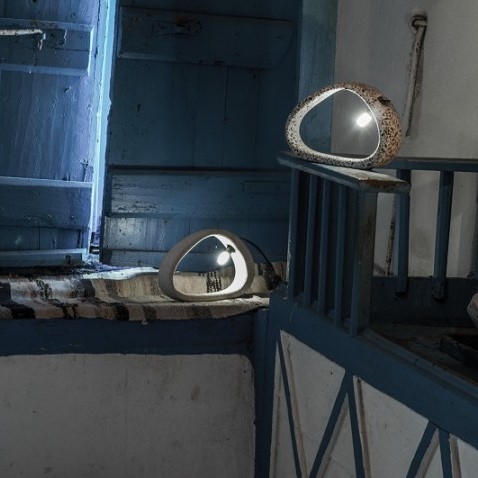 Επιτραπέζιο φωτιστικό από τσιμέντο, σε οργανική φόρμα. Διαθέσιμο σε πέντε χρωματισμούς: ανθρακί, γκρι, ιβουάρ, λευκό μωσαϊκό ή μαύρο μωσαϊκό. Η υφή του υλικού είναι αδρή λόγω της πρόσμιξης άμμου στο μίγμα τσιμέντου.