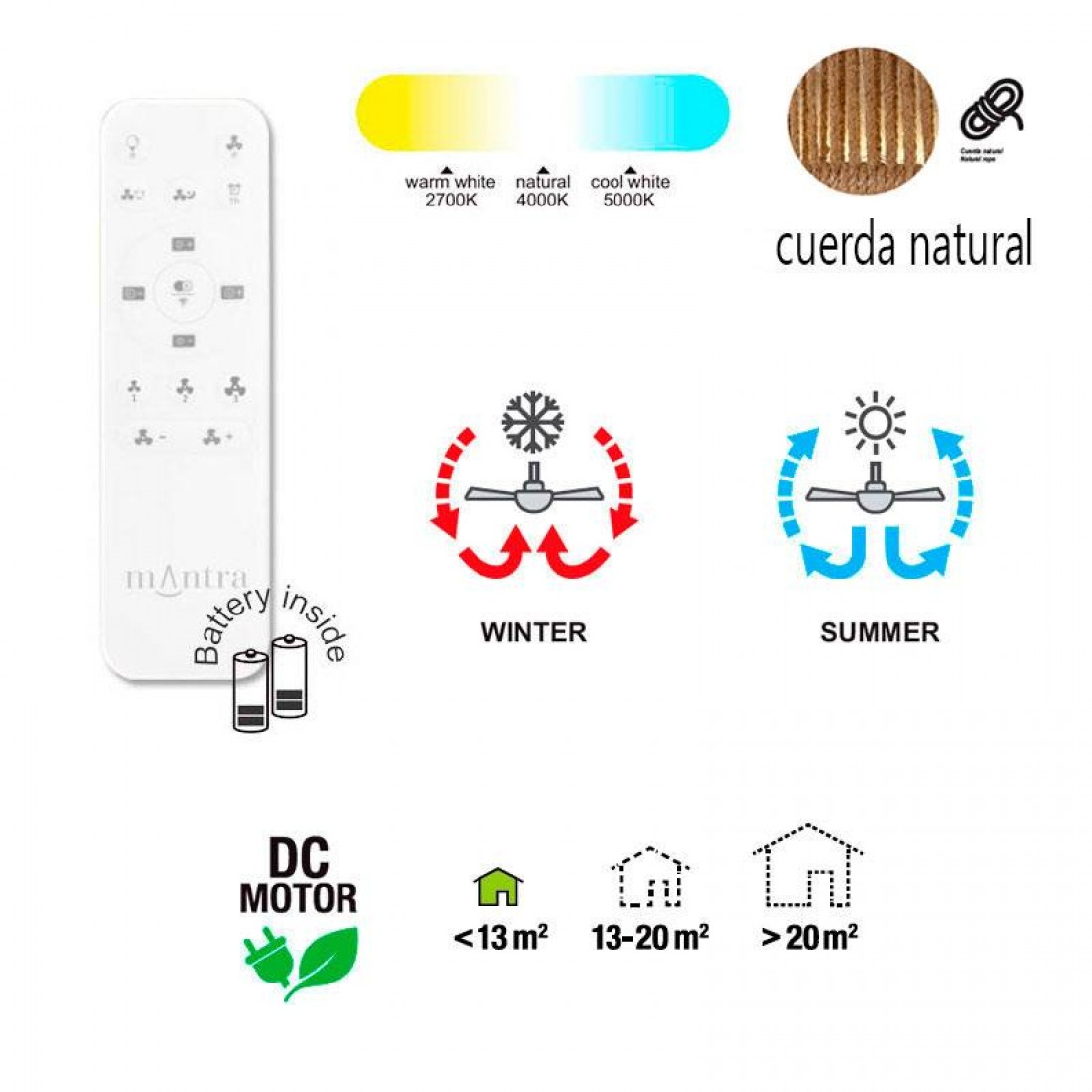 Λειτουργία χειμώνα-καλοκαίρι που βελτιώνει την απόδοση θέρμανσης το χειμώνα και δροσίζει τους χώρους το καλοκαίρι. Όλες οι λειτουργίες του ανεμιστήρα οροφής Polinesia Natural ελέγχονται από τηλεχειριστήριο (περιλαμβάνεται).