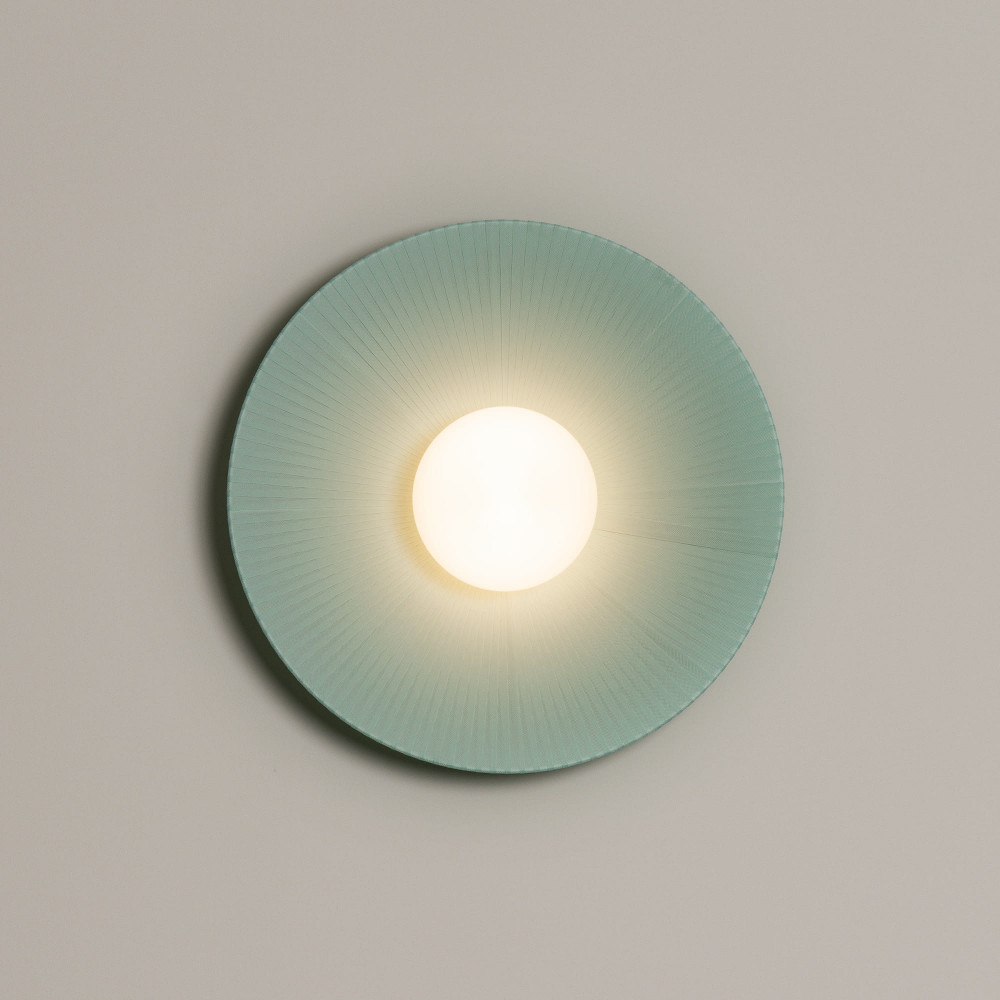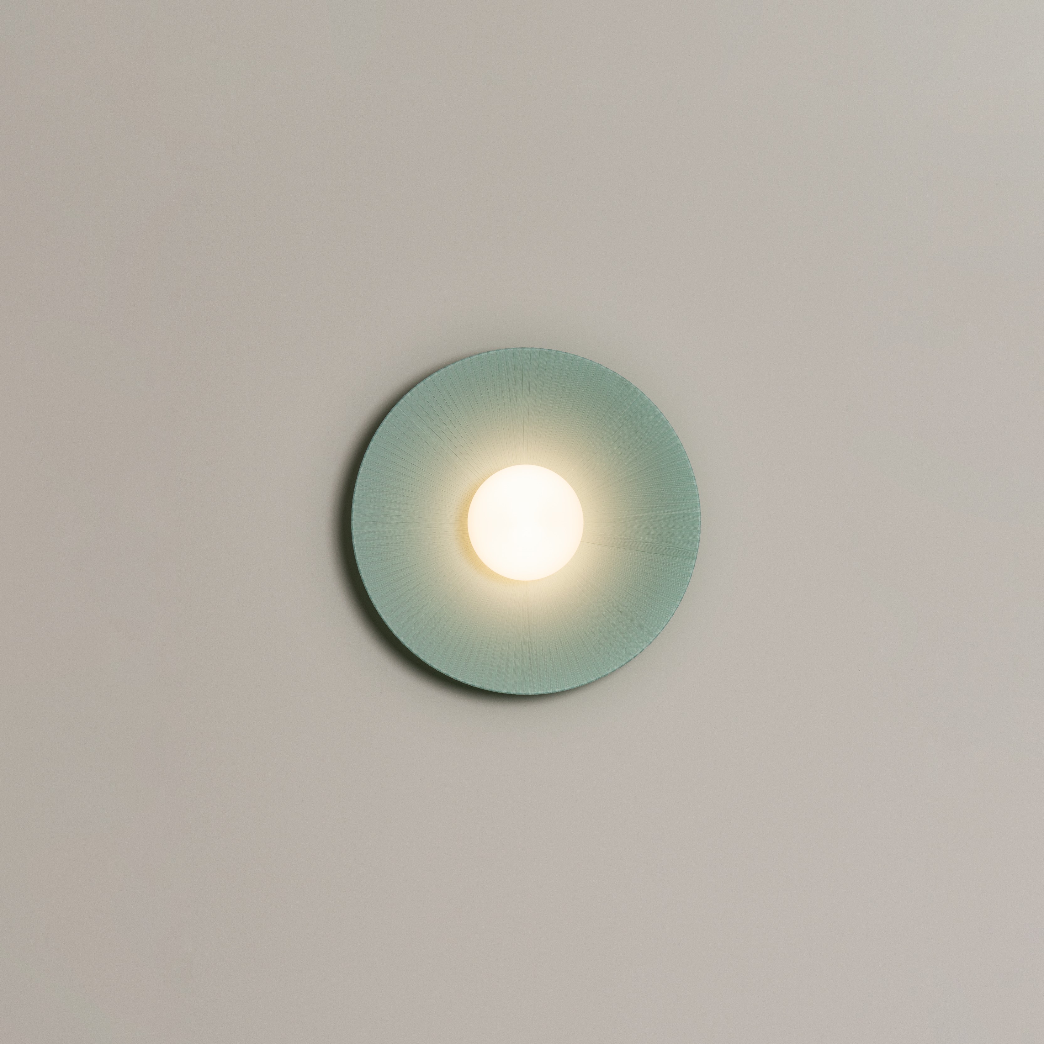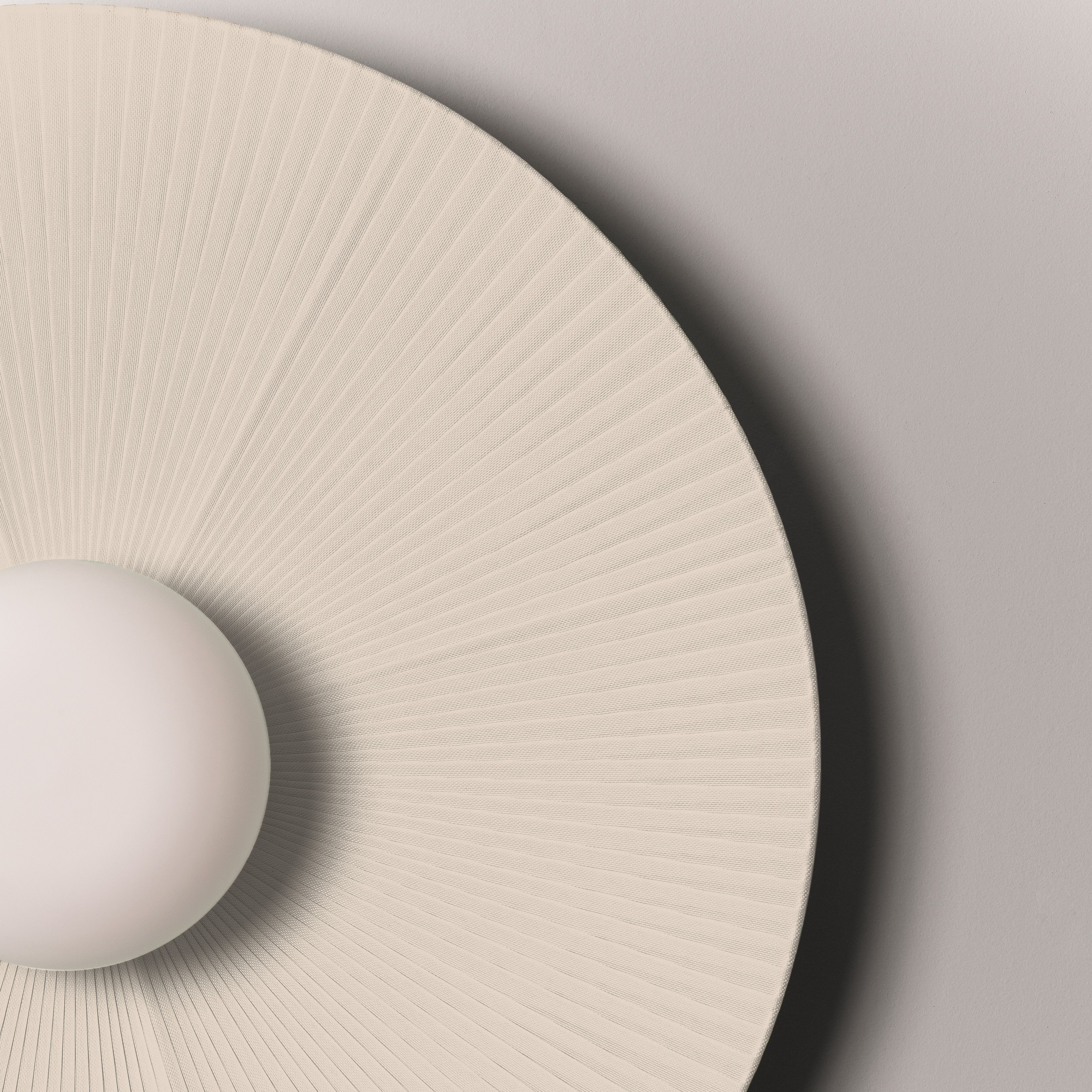 Artic Circle φωτιστικό τοίχου. Ο Αρκτικός Κύκλος χαρακτηρίζεται με υφασμάτινες κορδέλες διατεταγμένες ακτινωτά, οι οποίες συνδέονται μεταξύ τους για να συγκλίνουν στο κέντρο και να ενώνονται με τον γυάλινο διαχύτη σε έναν από τους πόλους του. Παρά το γεγονός ότι είναι ένα συμπαγές και σταθερό κομμάτι, το παιχνίδι των επικαλυπτόμενων κορδελών δίνει στη λάμπα μια ανάλαφρη όψη, παραπέμποντας στα στρώματα και τα κομμάτια πάγου που τρέχουν κατά μήκος του Αρκτικού Ωκεανού. Η συλλογή Arctic Circle έχει την αντιφατική ικανότητα να εκπέμπει δροσερό αέρα ενώ δημιουργεί ένα ζεστό κλίμα.