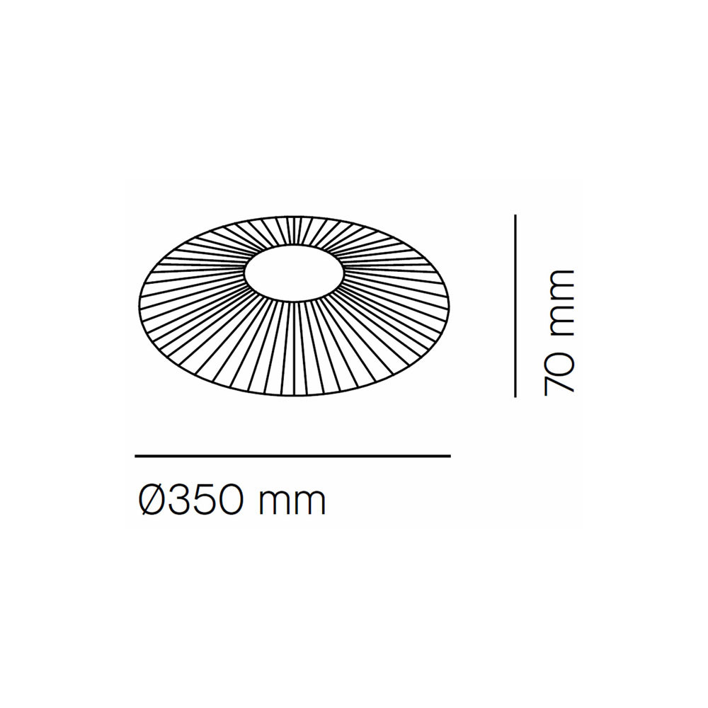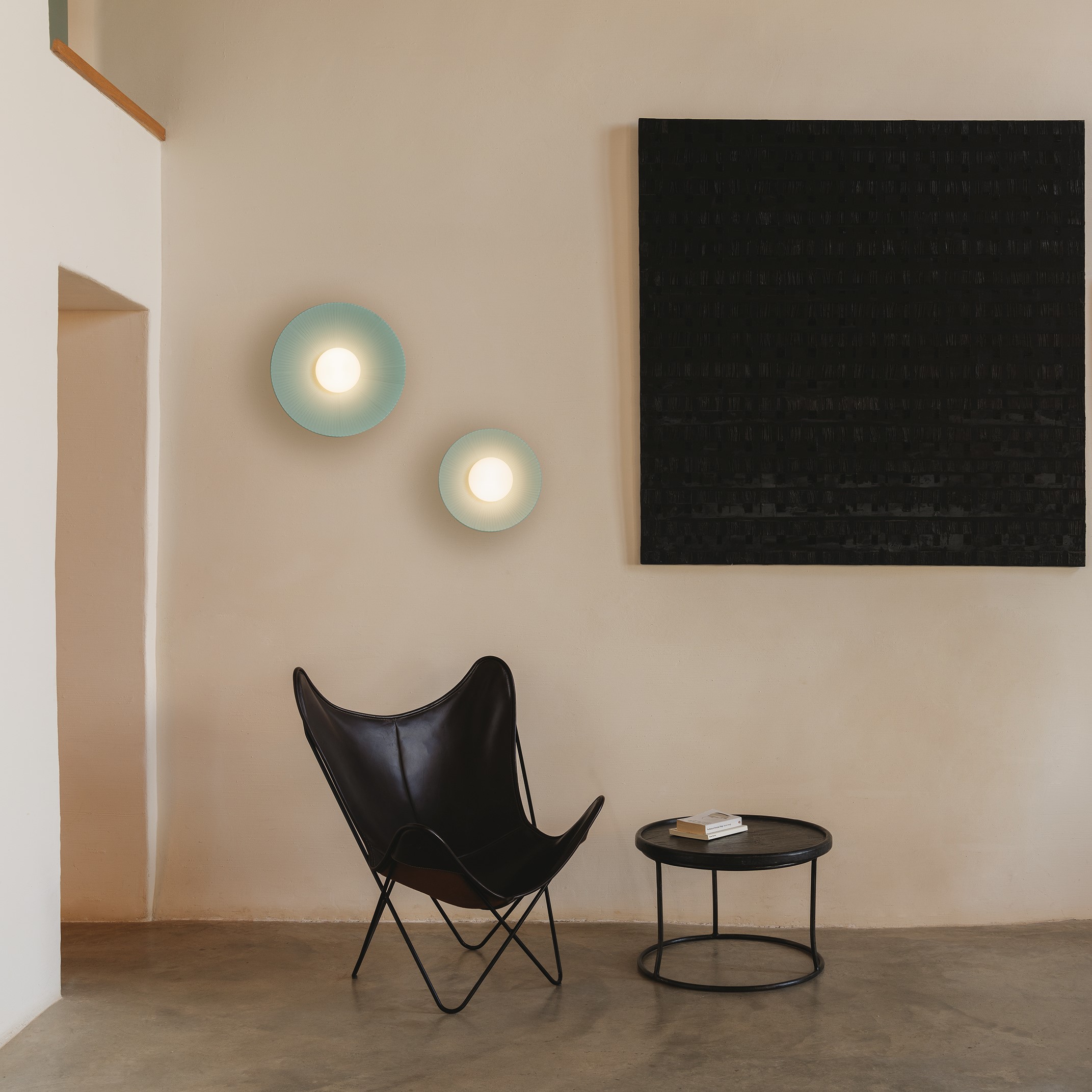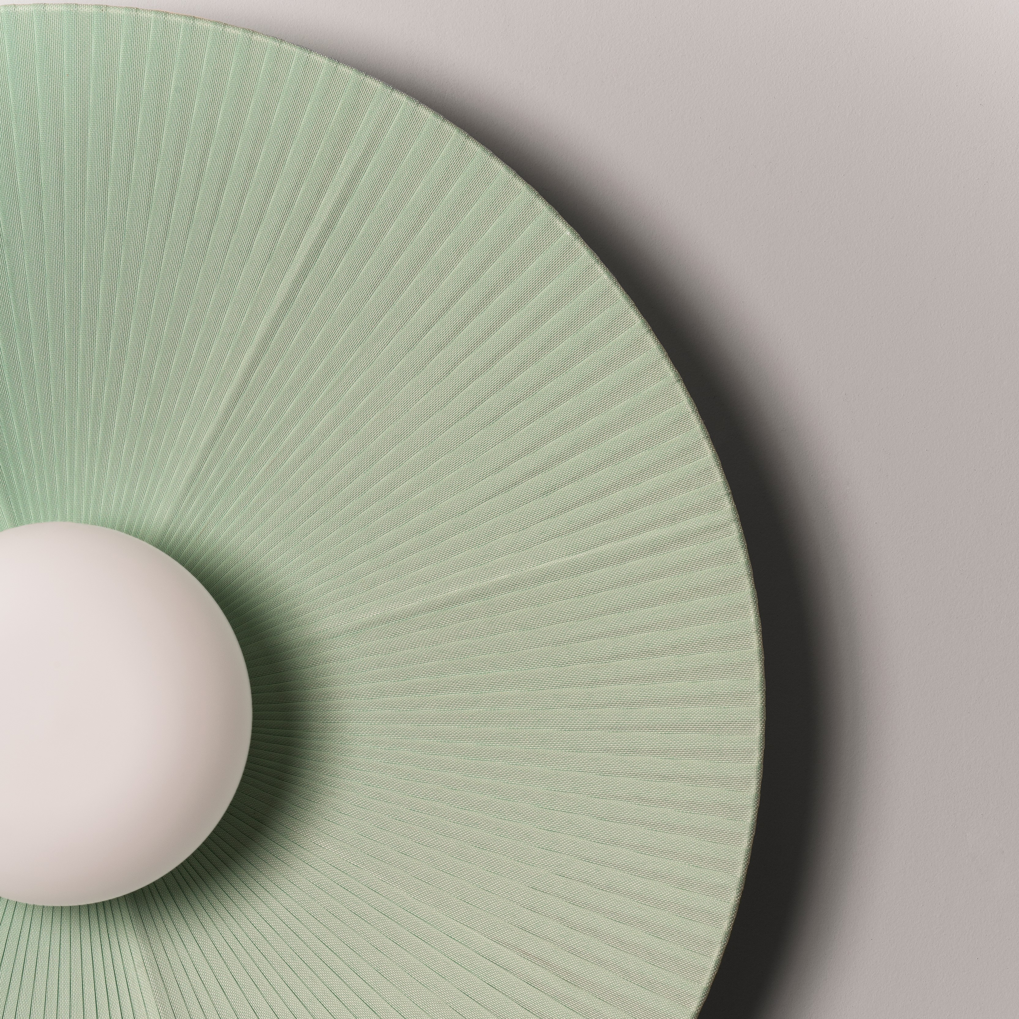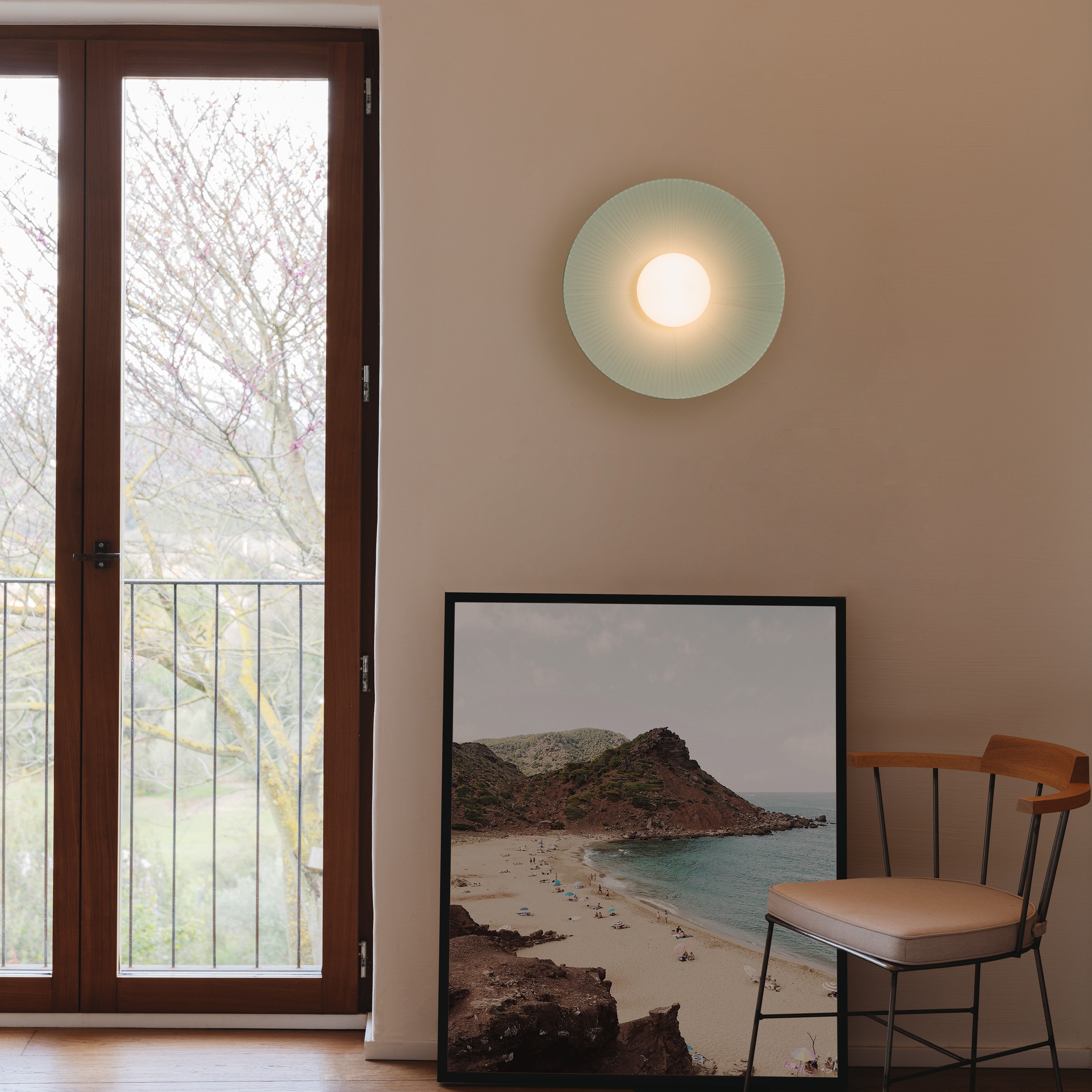 Artic Circle φωτιστικό τοίχου. Ο Αρκτικός Κύκλος χαρακτηρίζεται με υφασμάτινες κορδέλες διατεταγμένες ακτινωτά, οι οποίες συνδέονται μεταξύ τους για να συγκλίνουν στο κέντρο και να ενώνονται με τον γυάλινο διαχύτη σε έναν από τους πόλους του. Παρά το γεγονός ότι είναι ένα συμπαγές και σταθερό κομμάτι, το παιχνίδι των επικαλυπτόμενων κορδελών δίνει στη λάμπα μια ανάλαφρη όψη, παραπέμποντας στα στρώματα και τα κομμάτια πάγου που τρέχουν κατά μήκος του Αρκτικού Ωκεανού. Η συλλογή Arctic Circle έχει την αντιφατική ικανότητα να εκπέμπει δροσερό αέρα ενώ δημιουργεί ένα ζεστό κλίμα.