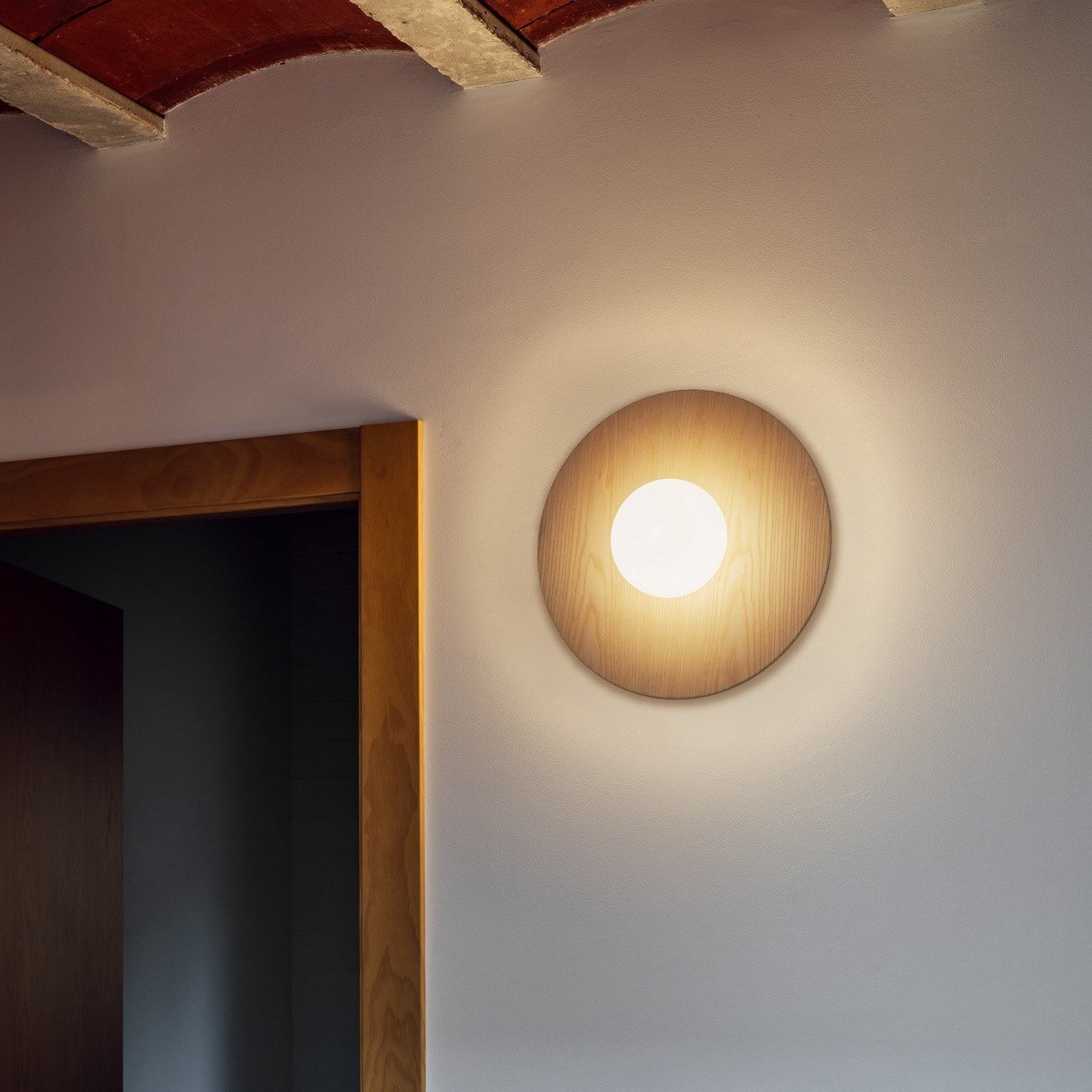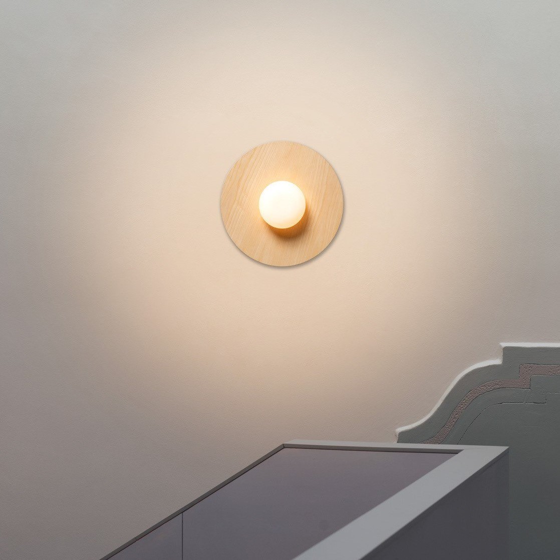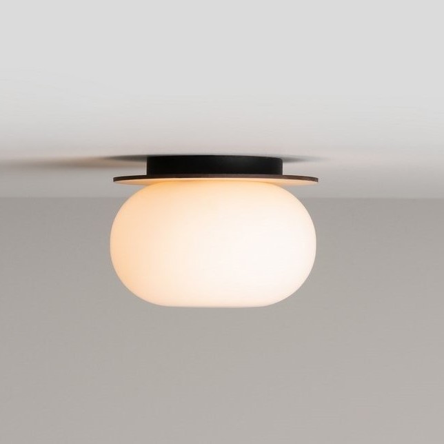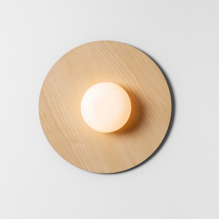 Knock Round φωτιστικό οροφής ή τοίχου. Αποτελείται από μία ξύλινη βάση (από τη μία πλευρά σε φυσικό ξύλο και από την άλλη βαμμένη σε μαύρο χρώμα - μπορεί να χρησιμοποιηθεί όποια πλευρά σας ταιριάζει) και διαχύτη από φυσητό γυαλί οπαλίνας. Το φως που εκπέμπεται από τη σφαίρα φυσητού γυαλιού είναι ζεστό και φιλικό. Το φωτιστικό είναι εύκολο στην εγκατάσταση, καθώς υπάρχει ένα σύστημα ελατηρίου στη βάση του για να διευκολύνει τη γρήγορη συναρμολόγηση.