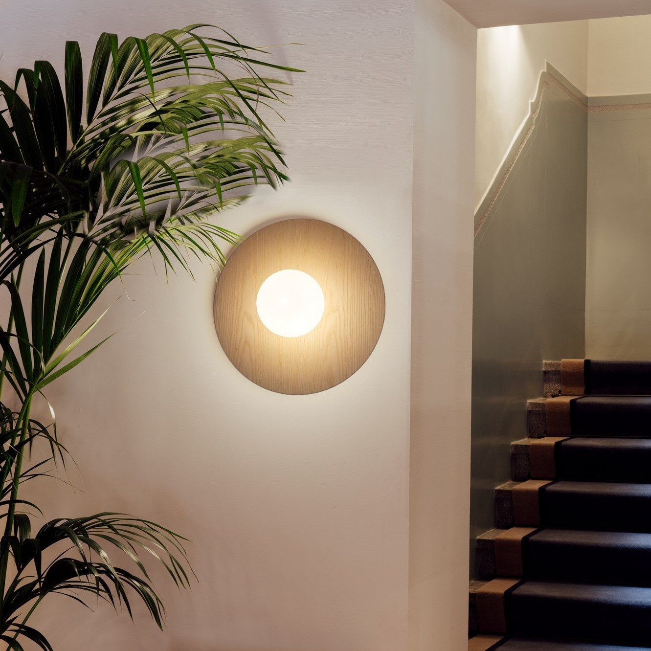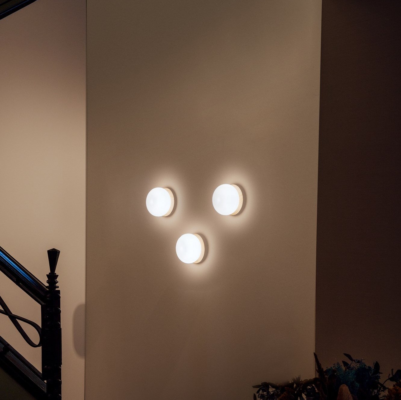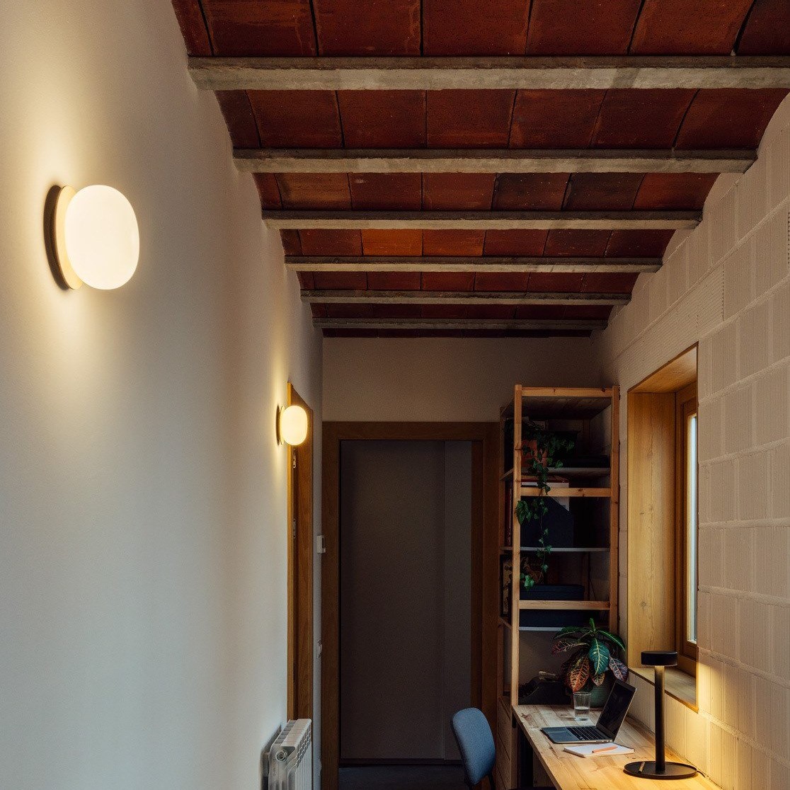 Knock Round φωτιστικό οροφής ή τοίχου. Αποτελείται από μία ξύλινη βάση (από τη μία πλευρά σε φυσικό ξύλο και από την άλλη βαμμένη σε μαύρο χρώμα - μπορεί να χρησιμοποιηθεί όποια πλευρά σας ταιριάζει) και διαχύτη από φυσητό γυαλί οπαλίνας. Το φως που εκπέμπεται από τη σφαίρα φυσητού γυαλιού είναι ζεστό και φιλικό. Το φωτιστικό είναι εύκολο στην εγκατάσταση, καθώς υπάρχει ένα σύστημα ελατηρίου στη βάση του για να διευκολύνει τη γρήγορη συναρμολόγηση.
