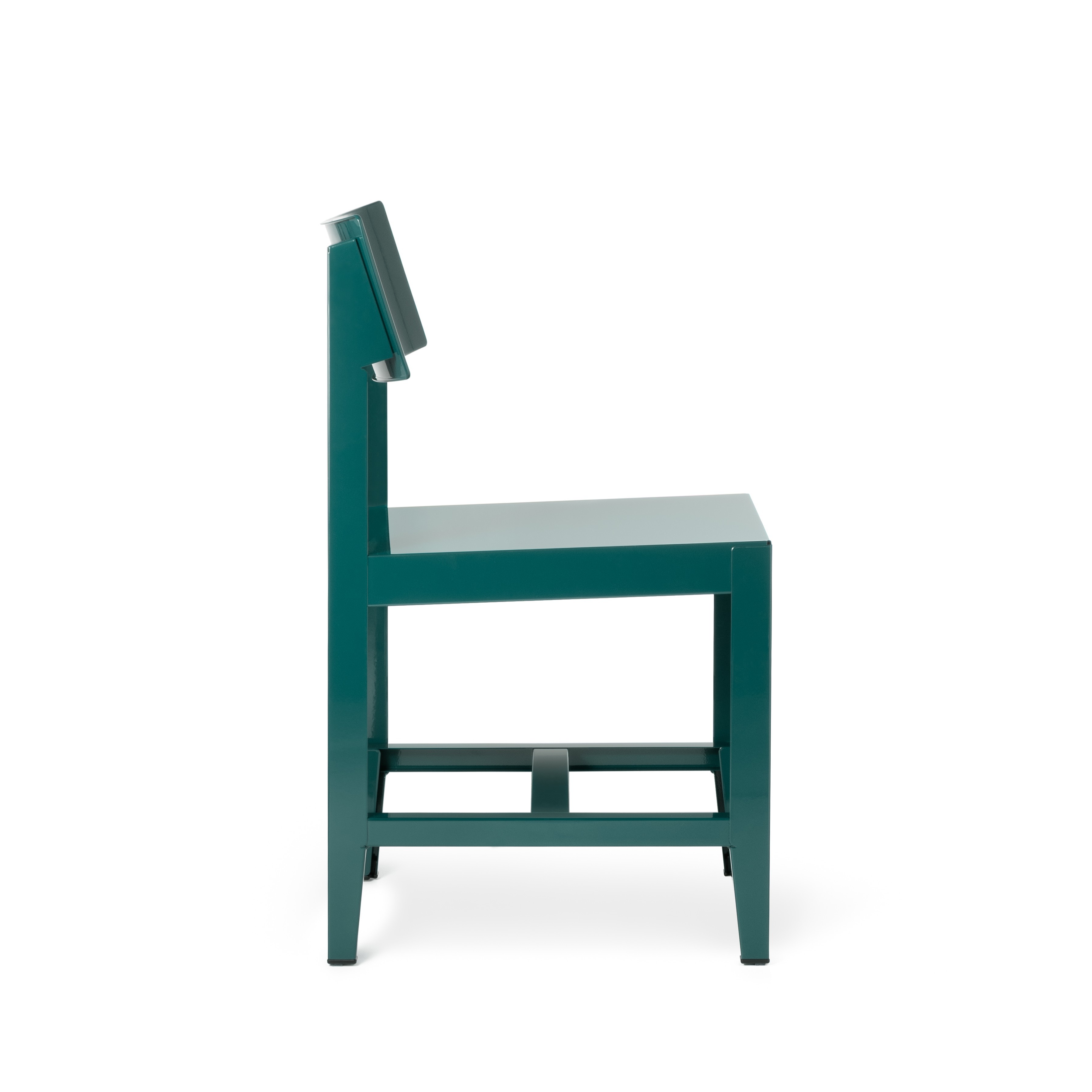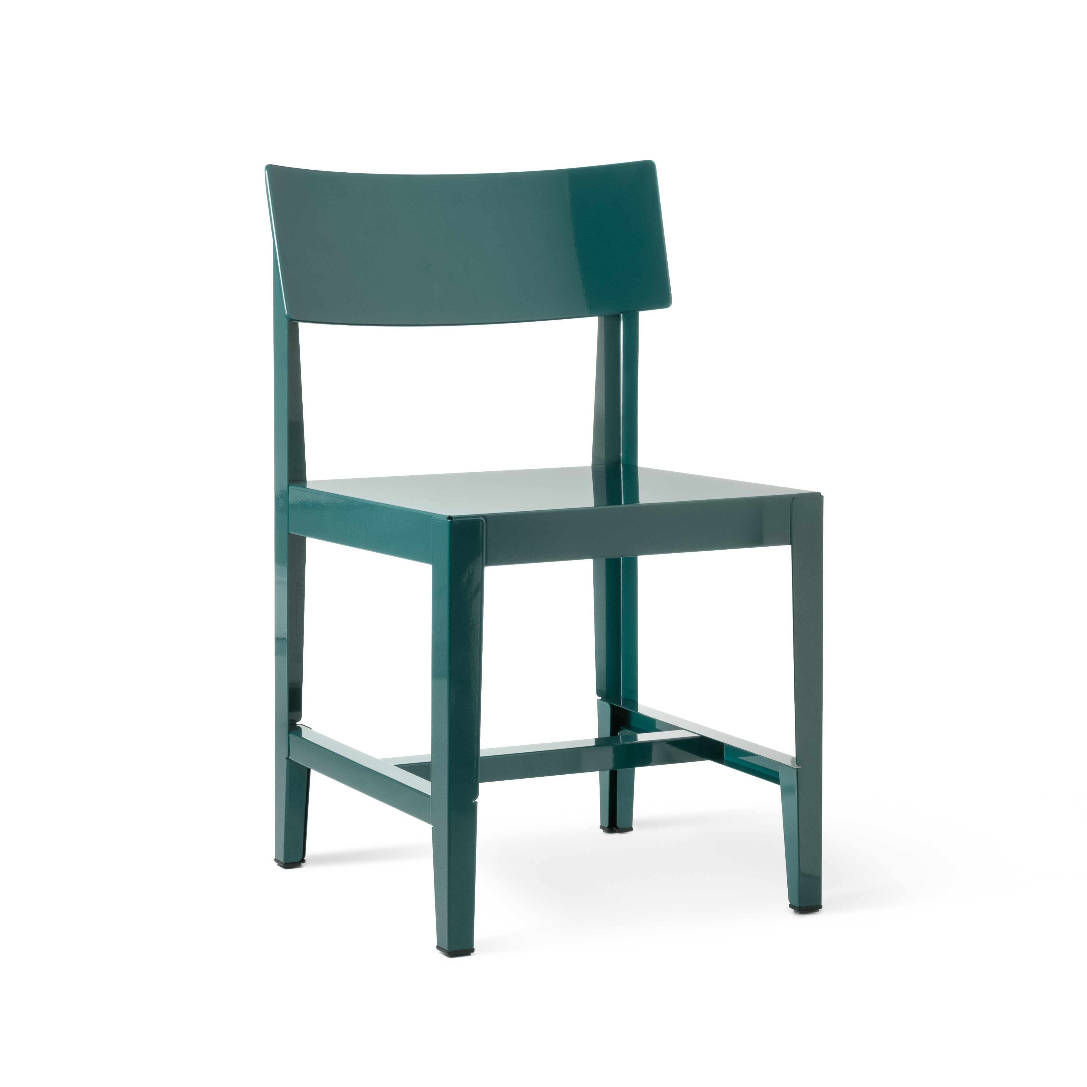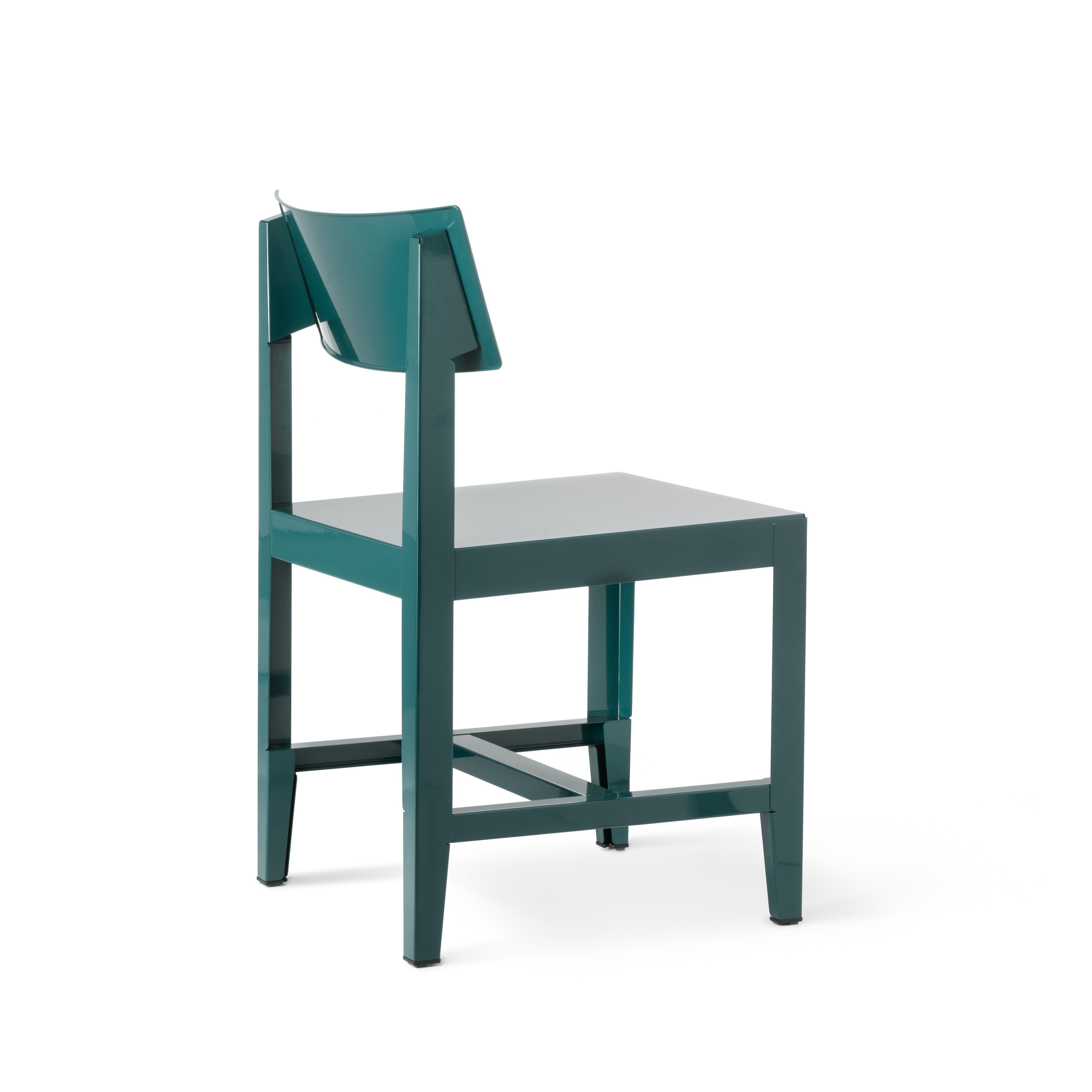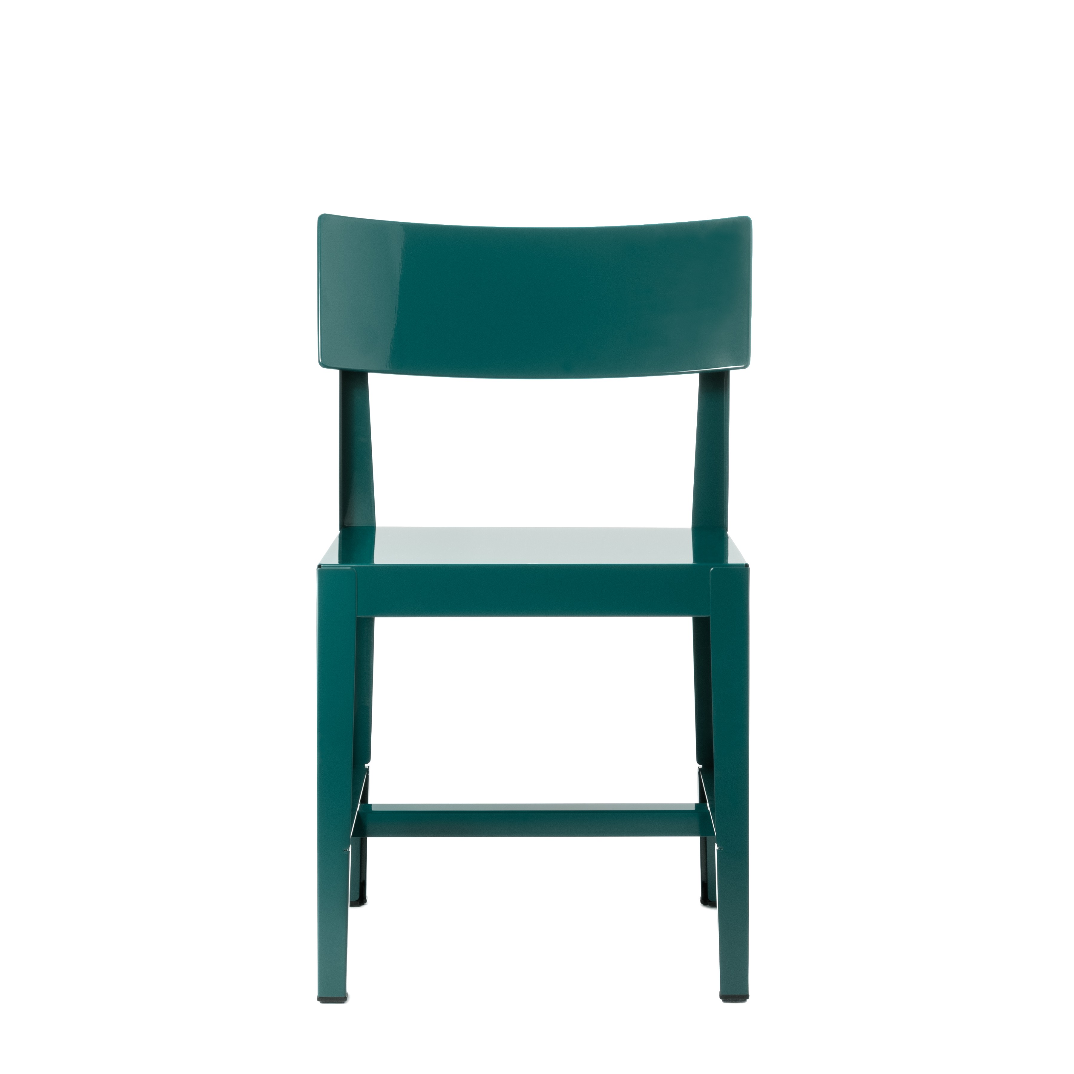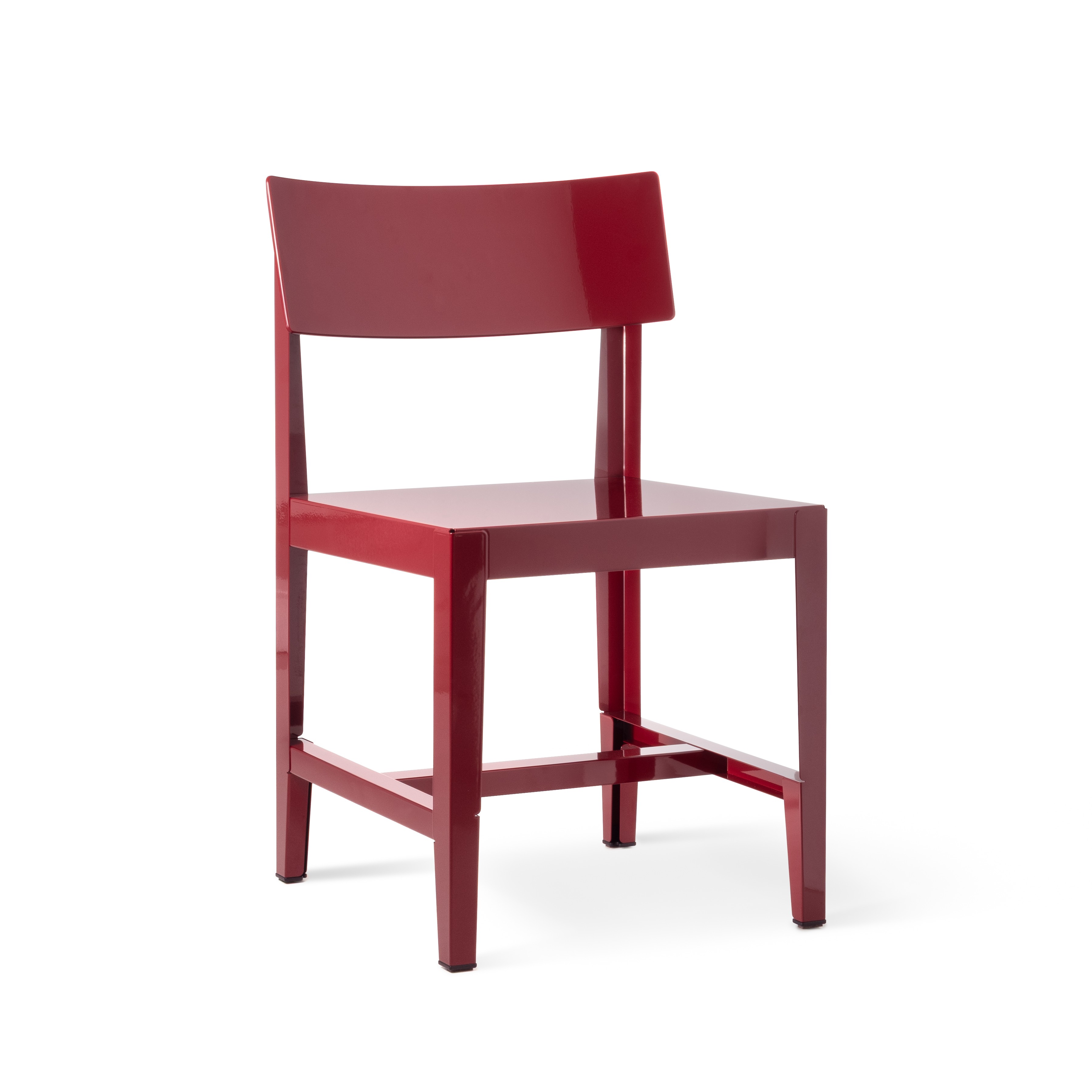 Είναι κατασκευασμένη από χαλύβδινη πλάκα πάχους 1 χιλιοστού, κομμένη με λέιζερ, λυγισμένη και συγκολλημένη, με γυαλιστερό φινίρισμα που αναδεικνύει τις τεχνικές λεπτομέρειες της καρέκλας.