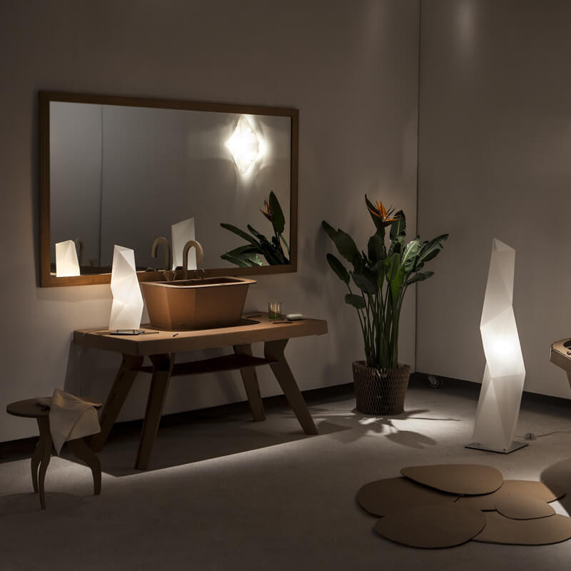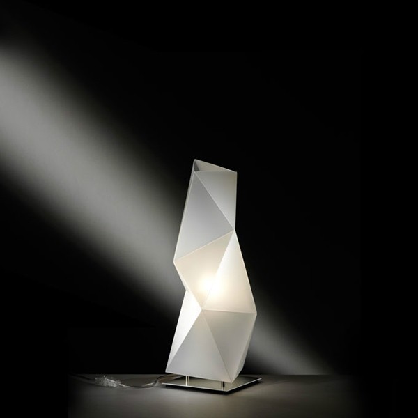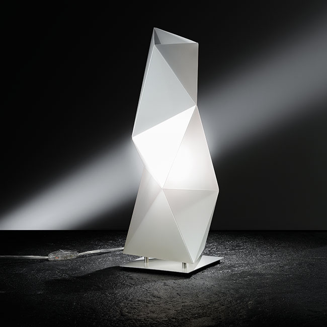 Επιτραπέζιο φωτιστικό Diamond σχέδιο των Paolucci,Stadera για την εταιρεία Slamp. Γλυπτική, δυναμική και μοντέρνα φόρμα, εμπνευσμένη από τα εμβληματικά έργα του Brancusi. Ο γεωμετρικός σχεδιασμός του Diamond επιτρέπει στο φως να τονίσει τις διάφορες όψεις και γωνίες του. Το Diamond είναι κατασκευασμένο από Opalflex®.