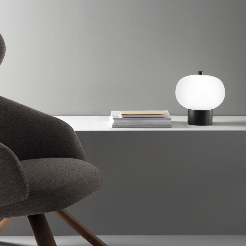 Ilargi επιτραπέζιο φωτιστικό. Το όνομα του φωτιστικού παραπέμπει στο «φεγγάρι» στα Βασκικά, έχει ένα λεπτό και μινιμαλιστικό σχέδιο, που περιλαμβάνει μια ξύλινη βάση επάνω στην οποία ακουμπάει μία σφαίρα από φυσητό γυαλί οπαλίνας, μία φόρμα που θυμίζει γλυπτό. Το φωτιστικό είναι διαθέσιμο σε δύο διαστάσεις και δύο επιλογές όσον αφορά στο ξύλο: φυσικό ή βαμμένο μαύρο. Διαθέσιμο με ροοστάτη αφής.