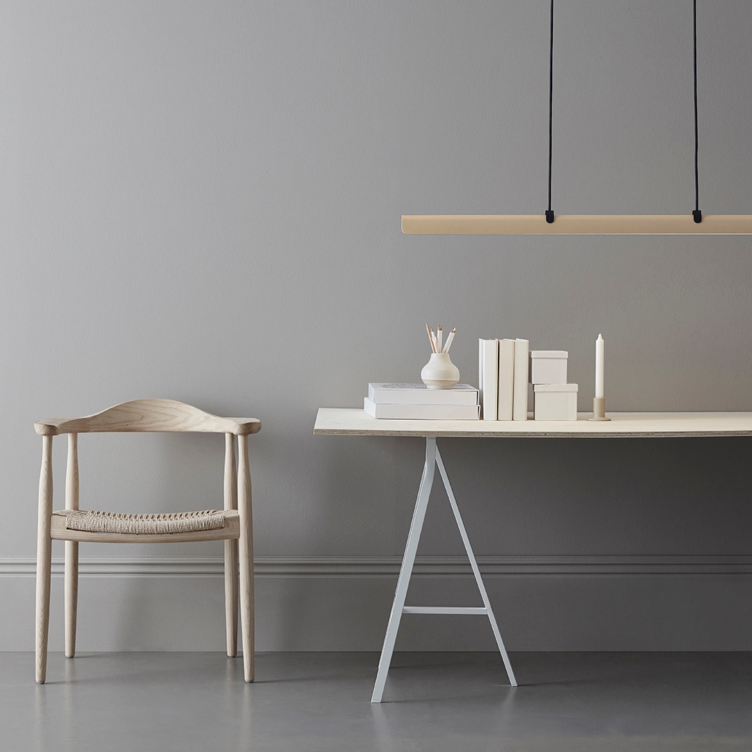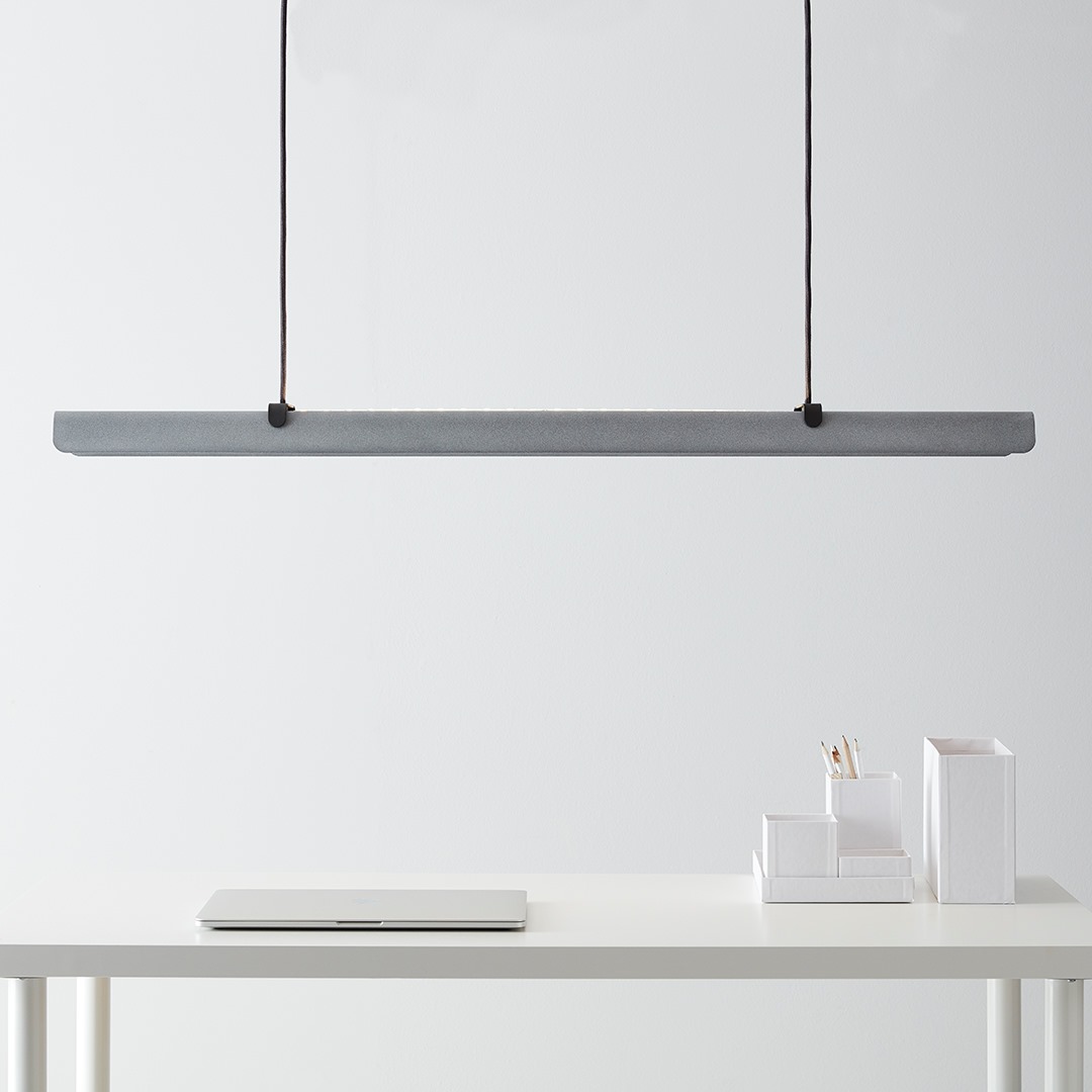 Γραμμικό κρεμαστό φωτιστικό Fold από μέταλλο βαμμένο σε τέσσερις επιλογές: λευκό, μαύρο, στο χρώμα της άμμου ή στο γκρι του τσιμέντου. Το φωτιστικό δίνει άμεσο φωτισμό και μπορεί να φωτίσει εξίσου επαγγελματικούς ή οικιακούς χώρους.