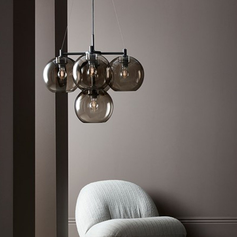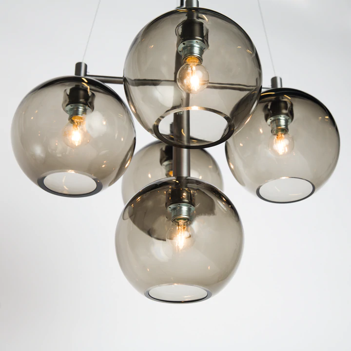Το κρεμαστό φωτιστικό Gloria είναι ένας μοντέρνος πολυέλαιος σχεδιασμένος από τον Joakim Fihn. Η μεταλλική δομή του φωτιστικού είναι διαθέσιμη σε ορείχαλκο ή μαύρο και οι διαχύτες είναι από φυσητό γυαλί σε γκρι φουμέ χρώμα. Ο πολυέλαιος Gloria έχει μία ρετρό και ταυτόχρονα μοντέρνα αναφορά. Το φως εμφανίζεται με όμορφο και διακοσμητικό τρόπο μέσα από το χειροποίητο γυαλί.